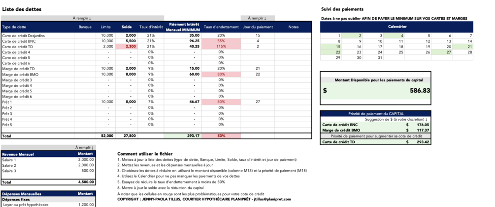 Ce fichier t'aideras a prioriser tes dettes et t'assurer d'un suivi de tes différents paiements.